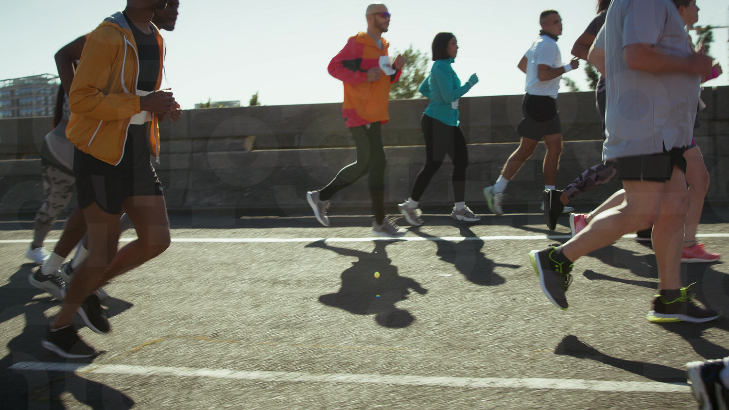 People of various ages and backgrounds run together on a highway. They are exercising for health, fitness, and collective wellbeing, demonstrating active lifestyles and community spirit.