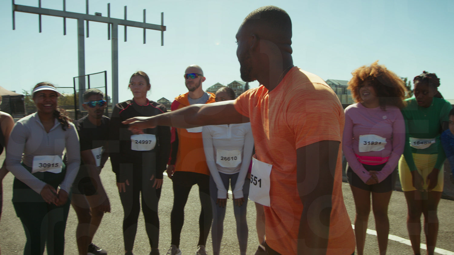 A group of athletic people gather with their coach, raising hands in excitement and anticipation before a sporting event. They are energized and motivated, preparing for a marathon or race.