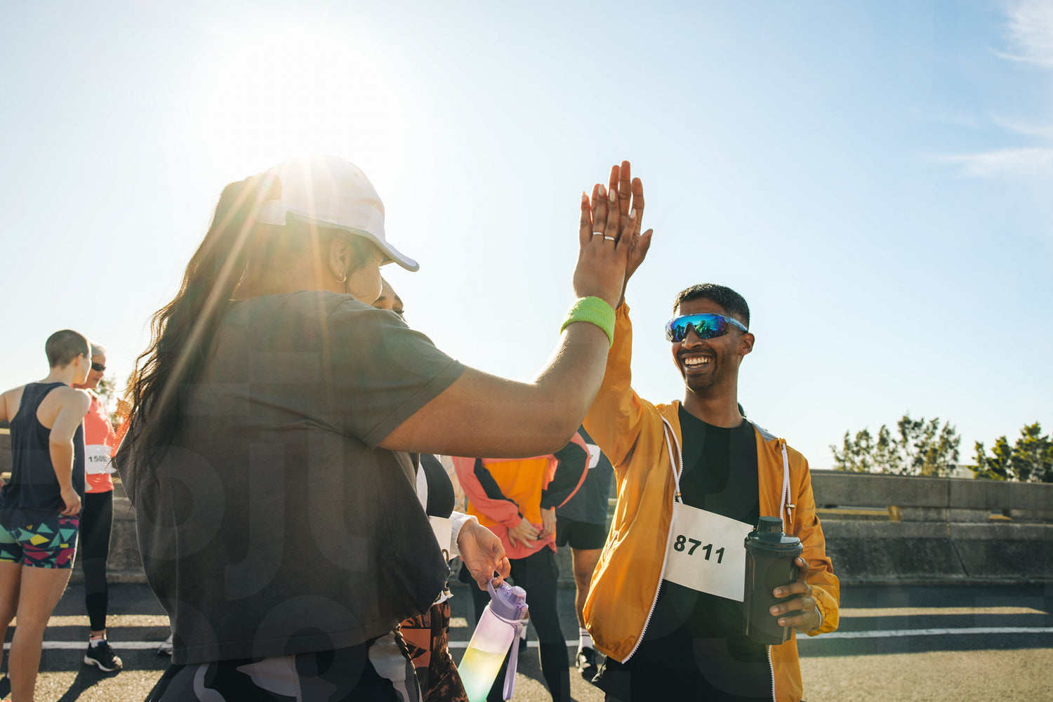 Participants in a marathon cheerfully celebrate with a high five under the bright sun. The atmosphere is filled with energy, camaraderie, and enthusiasm as runners encourage and support each other.