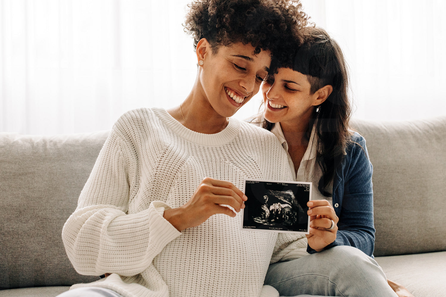 Same-sex pregnant couple holding up their ultrasound scan