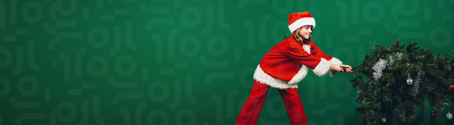 Girl in santa claus dress pulling a christmas tree for setting it up. Girl dressed as santa claus setting up a christmas tree.