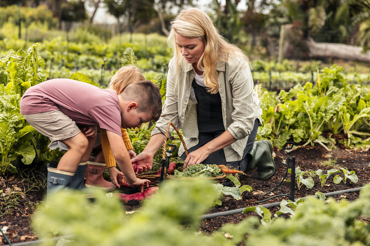 Family of three reaping fresh vegetables on an organic farm. Young single mother gathering fresh produce into a basket with her two children. Self-sustainable family harvesting on an agricultural field.
