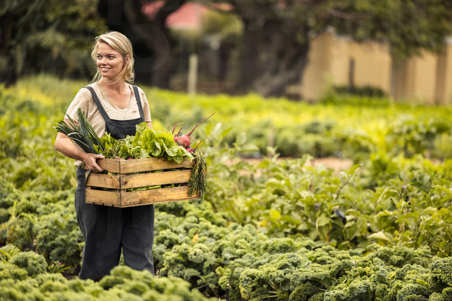 Self-sufficient organic farmer holding a box full of freshly picked produce on her farm. Happy female farmer smiling cheerfully while walking through her vegetable garden during harvest season.
