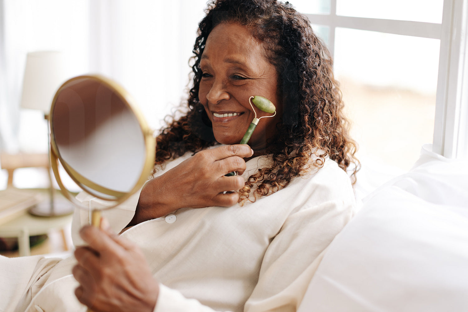Senior woman looking in the mirror as she massages her face with a jade roller, using gentle strokes to promote relaxation and smooth out fine lines. Woman caring for her melanin skin with natural remedies.
