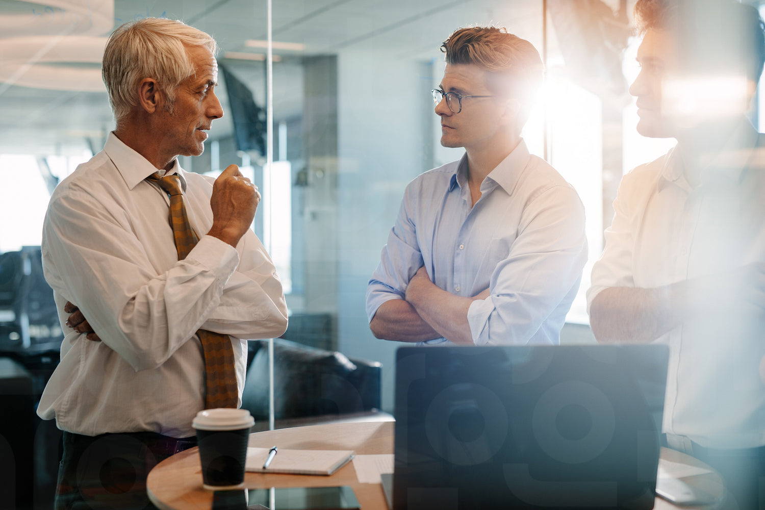 Shot of senior boss giving business instructions to man standing near by. Corporate professionals having standing meeting in modern office.