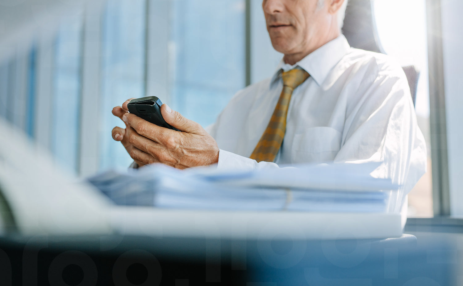 Cropped shot of senior business man sitting at his desk using mobile phone. Focus on hands of senior man reading text message on cell phone.