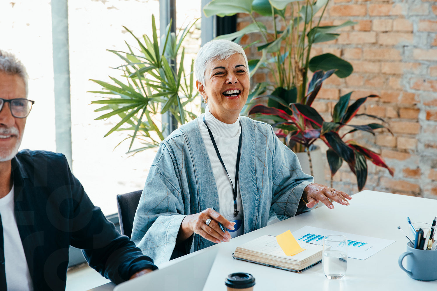 Senior business team meeting in modern office with cheerful atmosphere and thriving teamwork