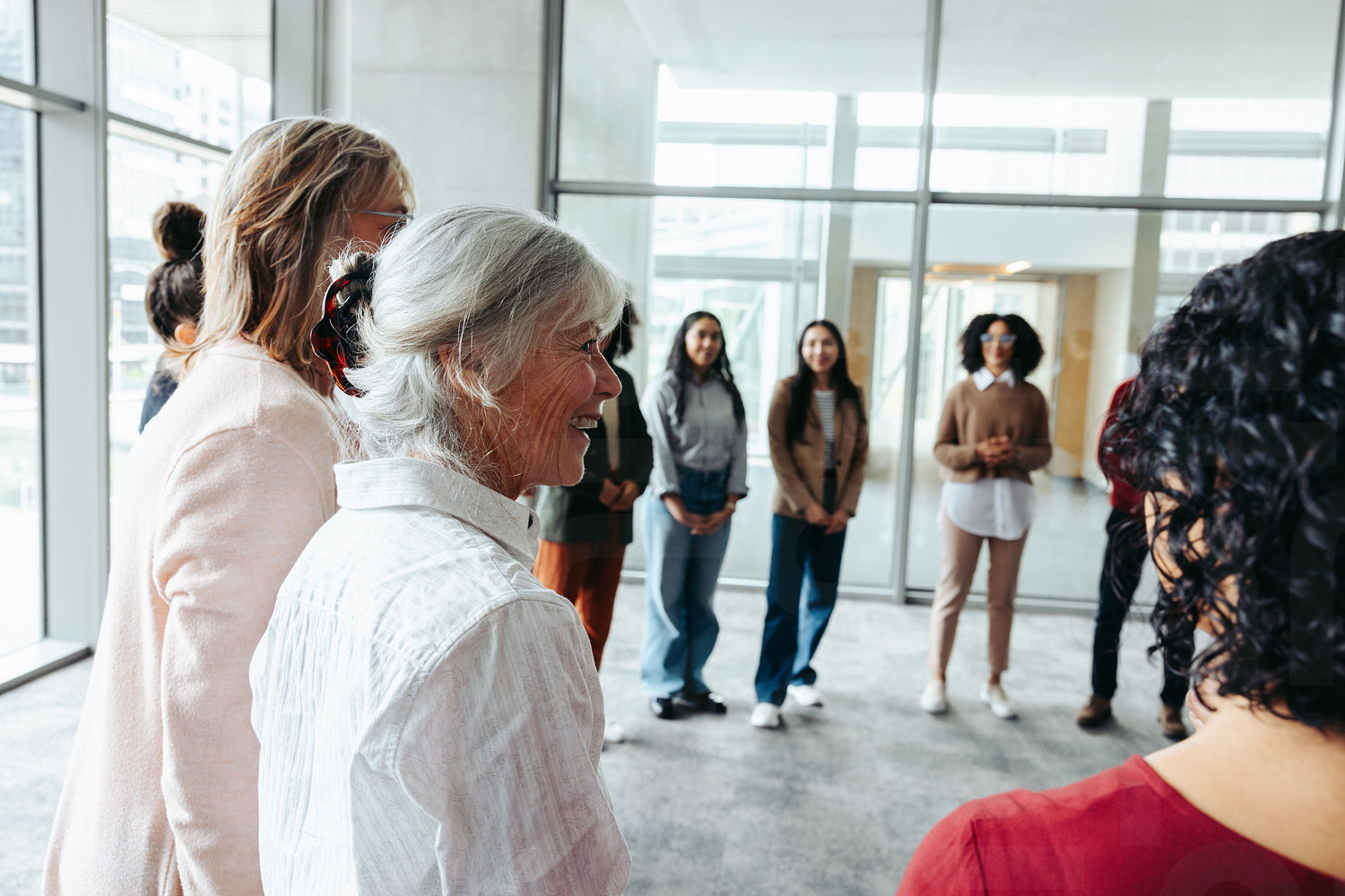 Senior business woman engaging with her diverse team during a corporate meeting in a modern, light-filled office environment.
