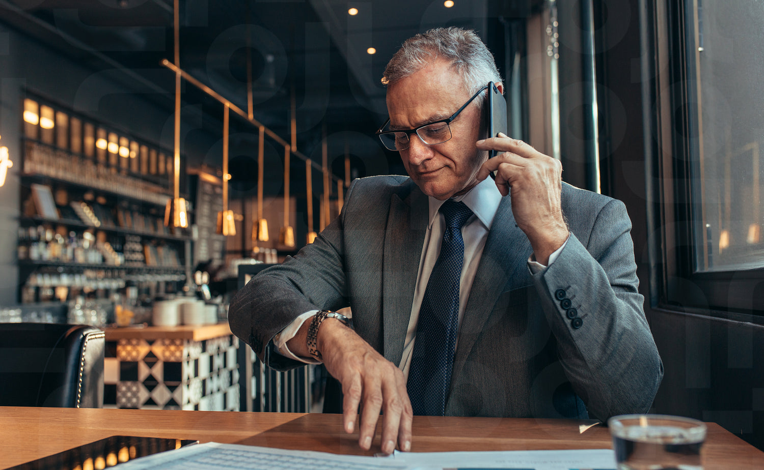 Senior businessman sitting at cafe making a phone call and checking time. Business professional waiting for someone at coffee shop talking over phone.