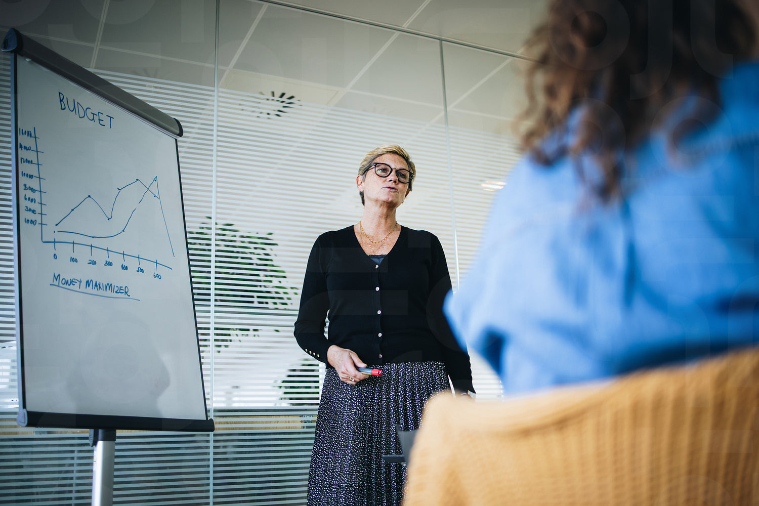 Senior businesswoman giving presentation to her team in office boardroom. Finance manager explaining the budget planning to business people during a meeting.