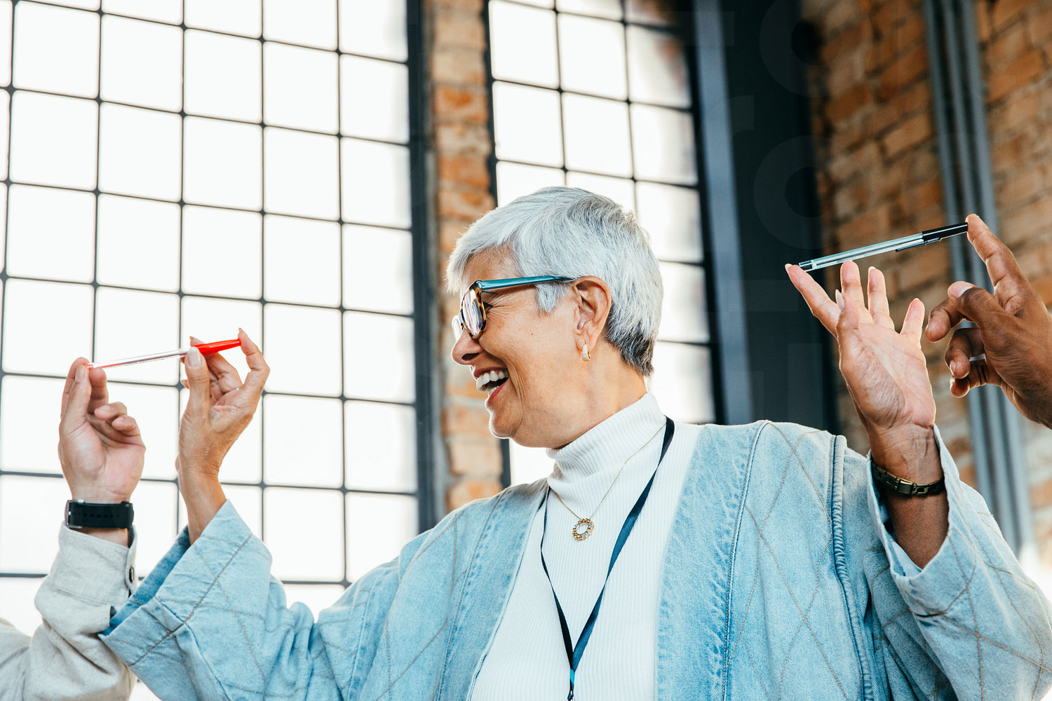 Senior businesswoman in professional setting shares a joyful moment while collaborating with colleagues in a modern office environment