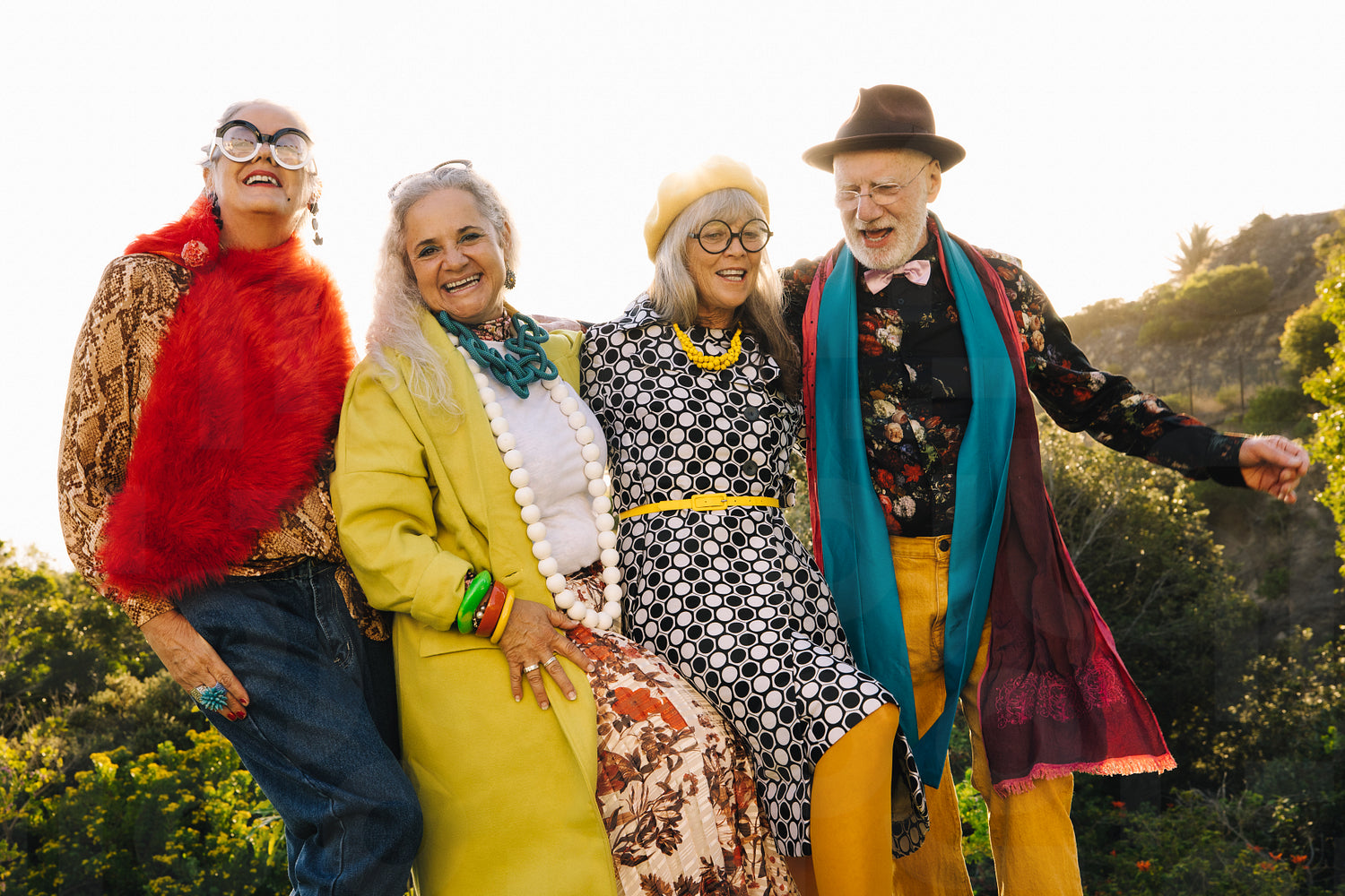 Senior citizens having fun while standing together in a park. Group of cheerful senior friends wearing colourful casual clothing. Carefree elderly people enjoying life after retirement.
