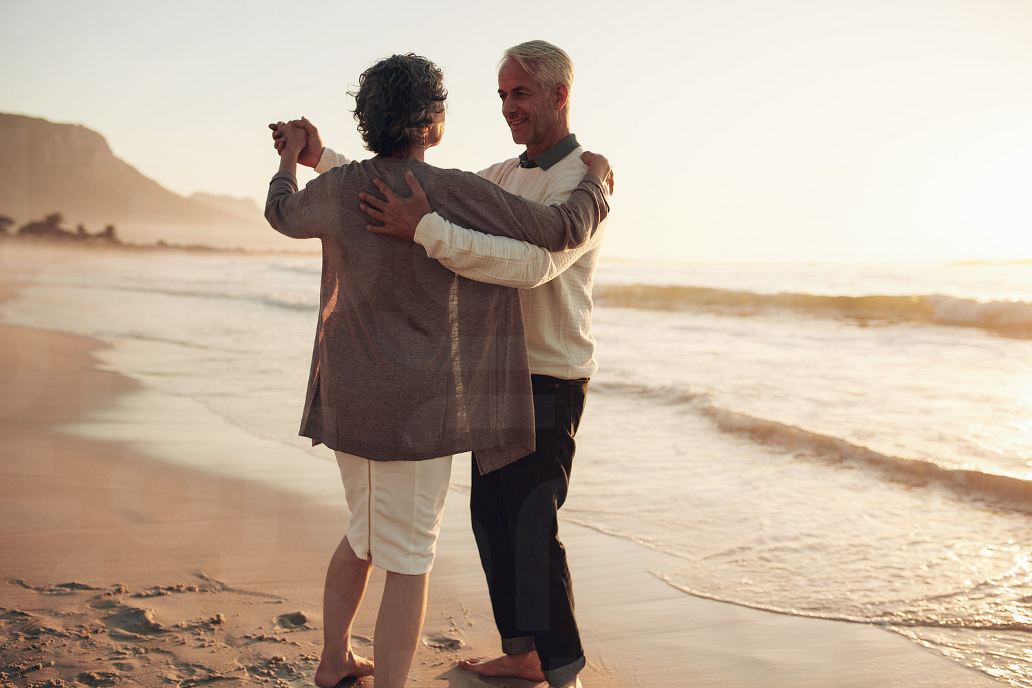 Senior man and woman couple dancing at sunset on the sea shore. Mature couple enjoying a romantic day at the beach.