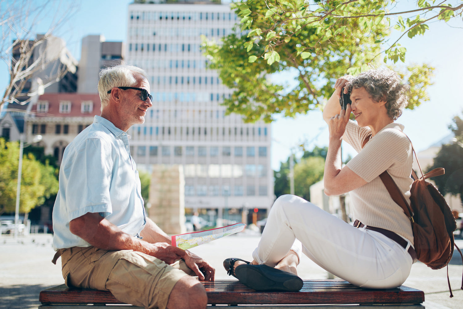 Side view of senior man sitting outdoors on a bench and woman taking his pictures with digital camera. Senior couple having fun on their vacation.
