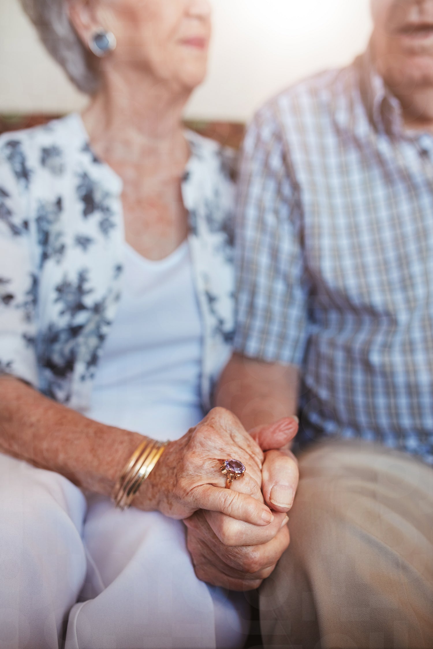 Cropped shot of senior couple holding hands while sitting together. Focus on hands.