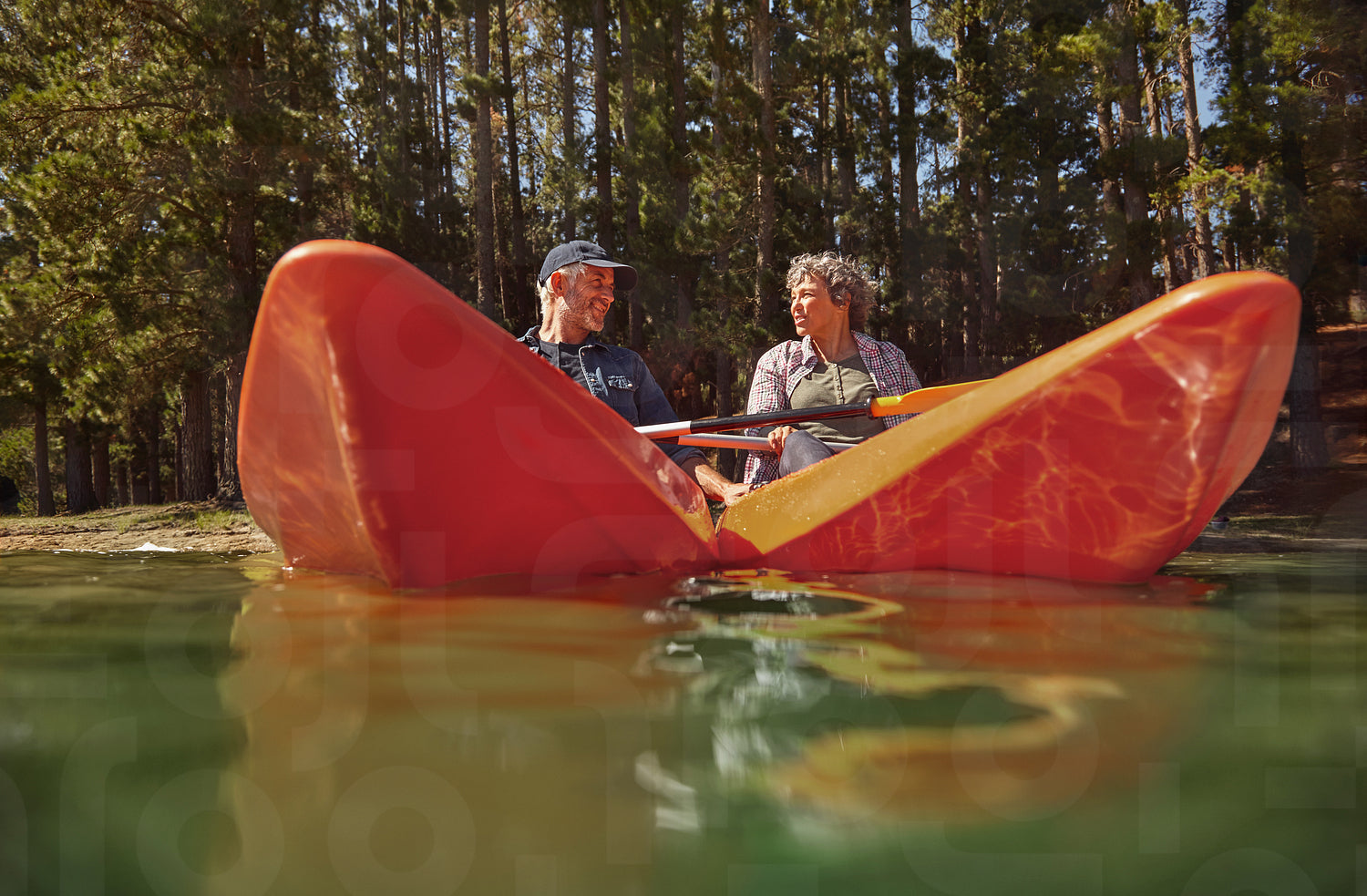 Active senior couple in two single kayaks side by side. Mature man and woman looking at each other and smiling while kayaking in a lake.