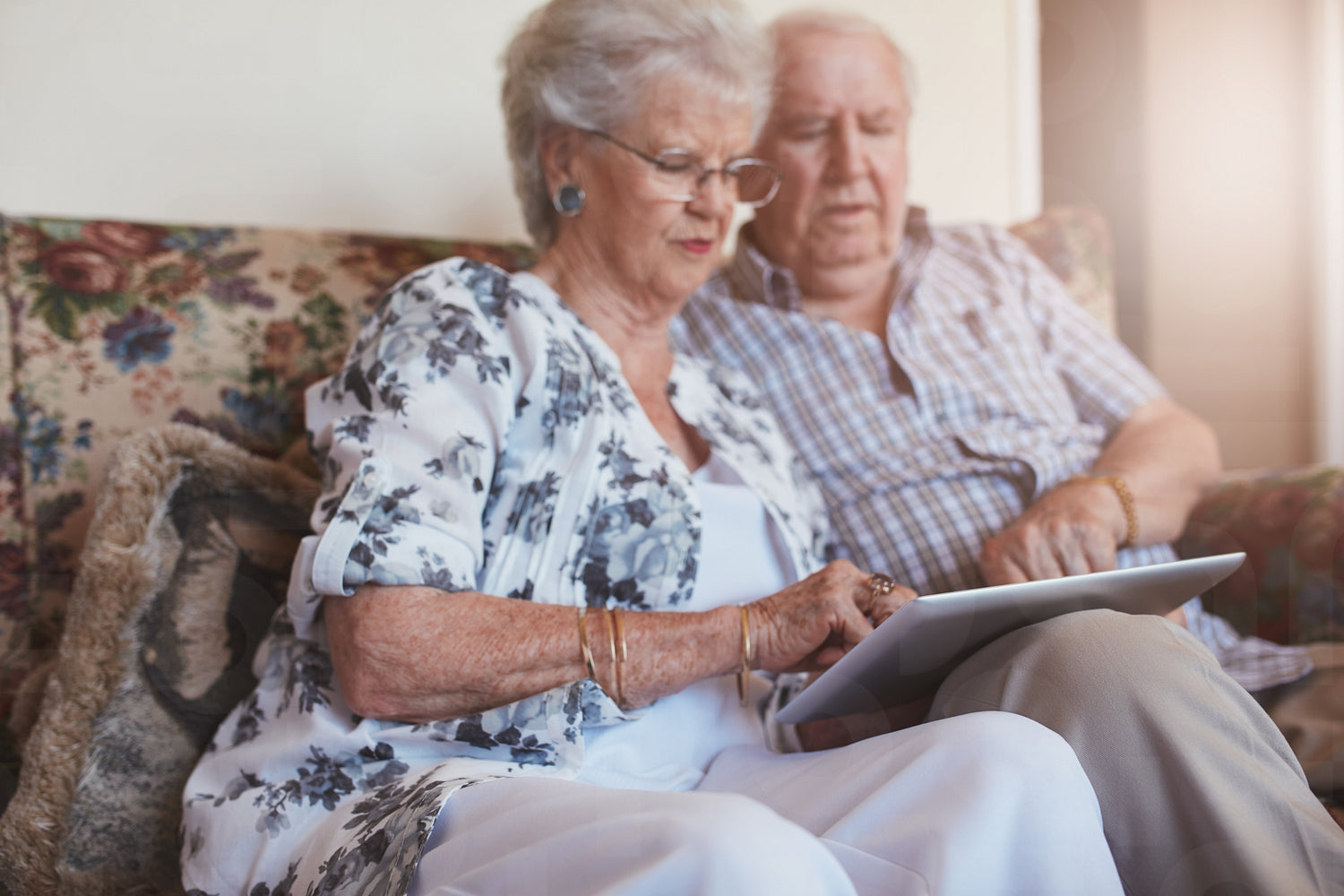 Portrait of old woman sitting with her husband and using digital tablet. Senior couple sitting on sofa at home with a touch screen computer.