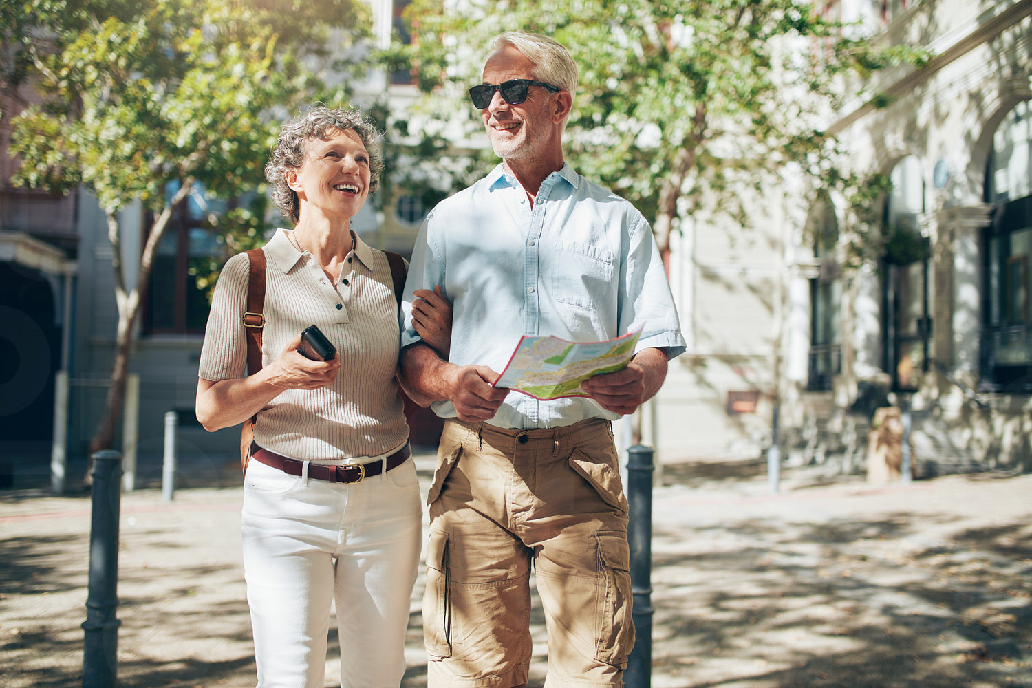 Middle aged couple roaming around the city holding a map. Senior couple with a map walking in the town.