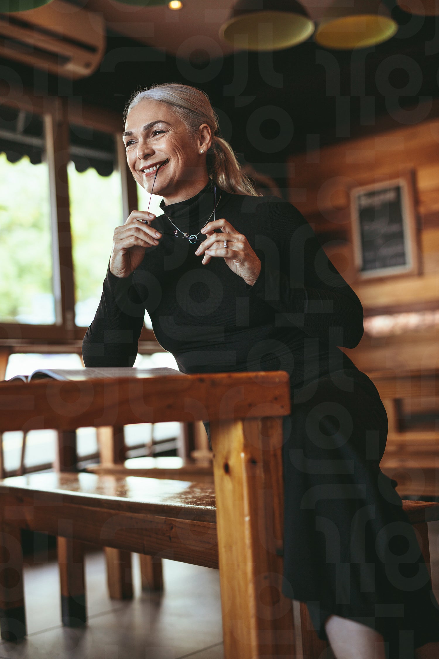 Portrait of smiling mature woman sitting at coffee shop and looking away. Senior female at cafe looking away and smiling.