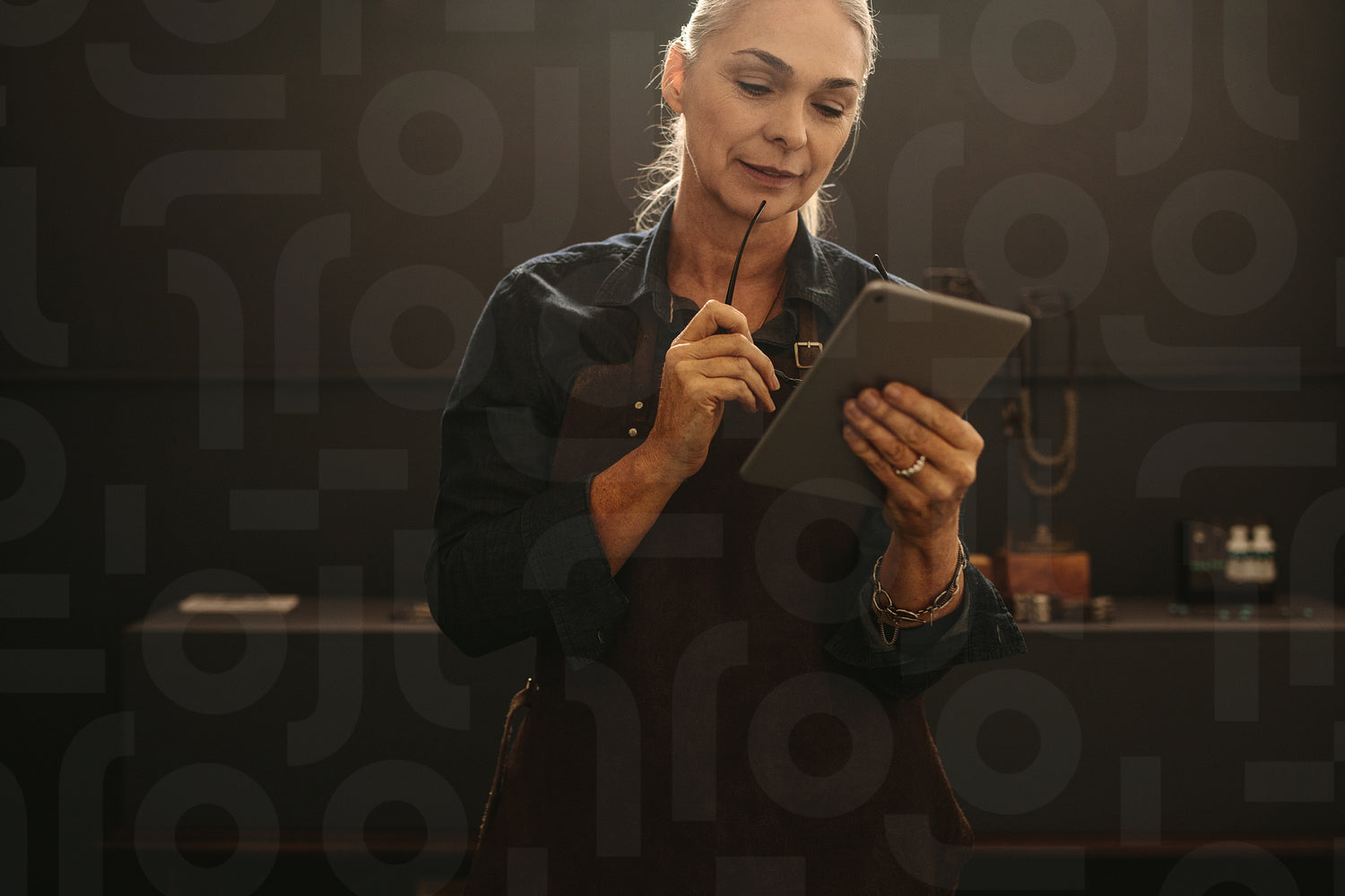 Portrait of mature woman jewelry designer using digital tablet in workshop. Senior woman in goldsmith workshop using tablet pc.