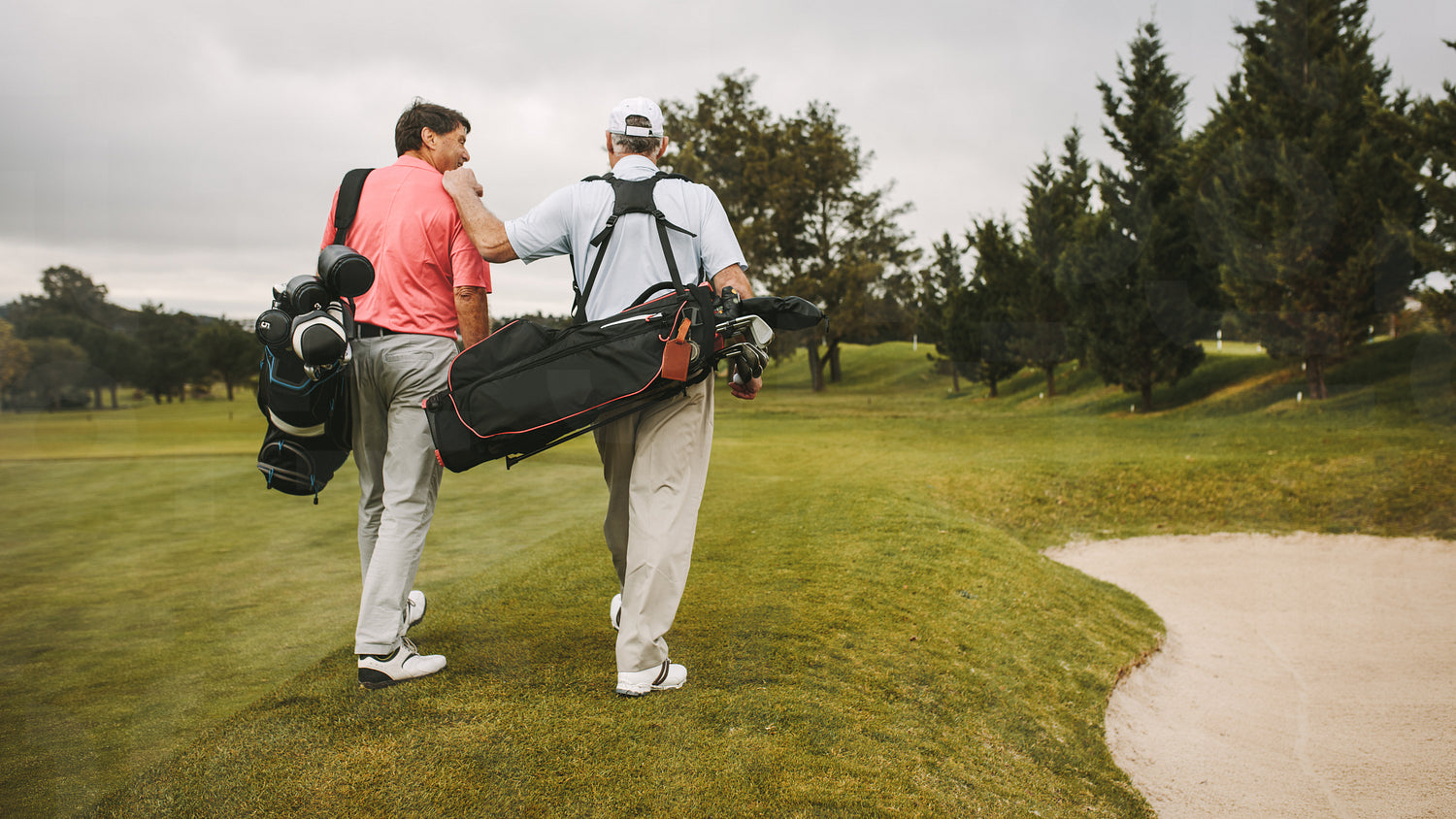 Rear view of two senior golf players walking together in the golf course with their golf bags. Senior golfers walking towards the next hole.