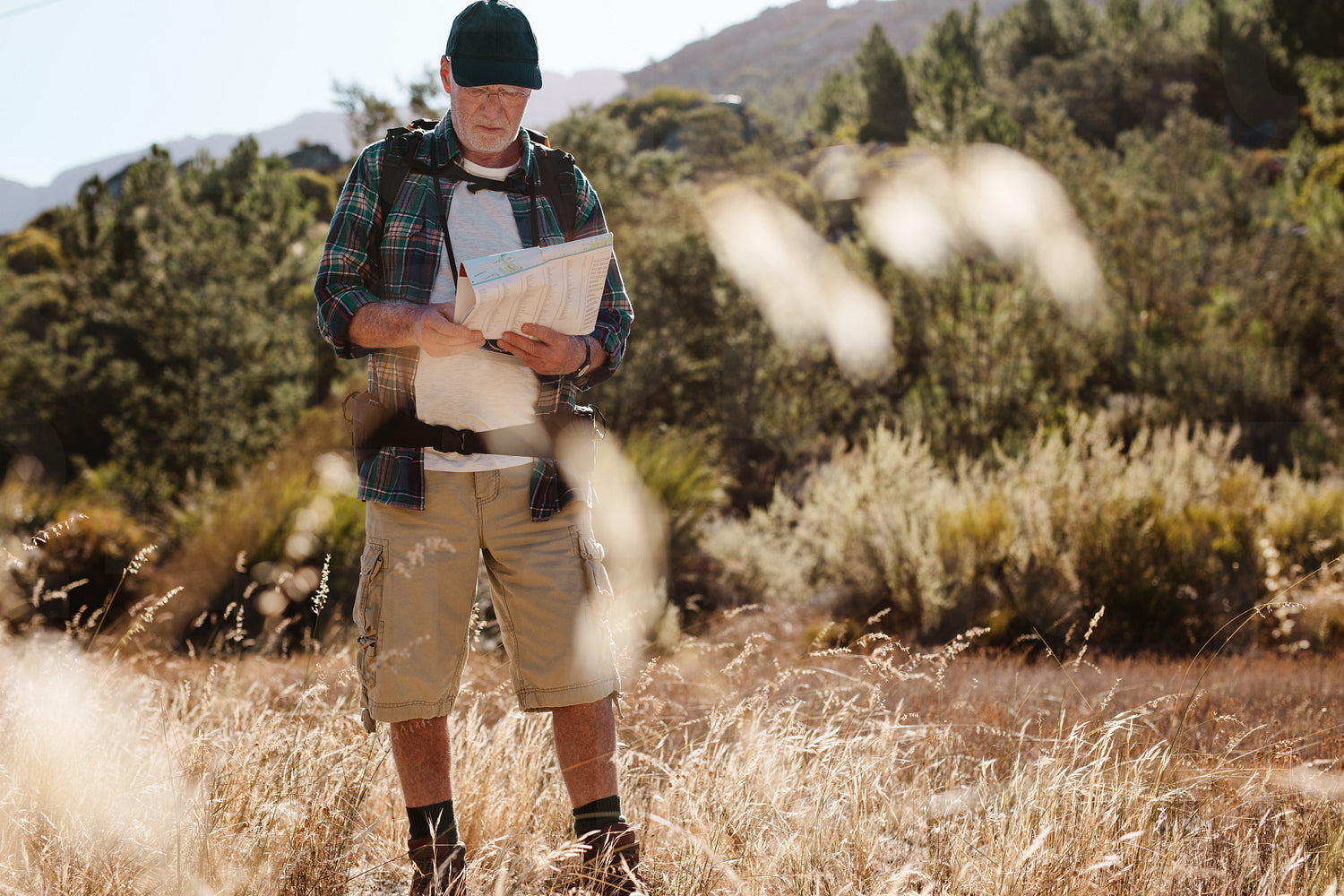 Senior man looking for the directions in a map while hiking. Old man on a hiking trip using map to find directions.
