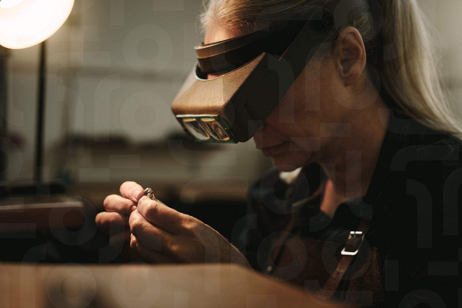 Close up of senior female jeweler examining a ring with magnifying glass. Woman jeweler looking through a magnifier to check for flaws in ring while making.