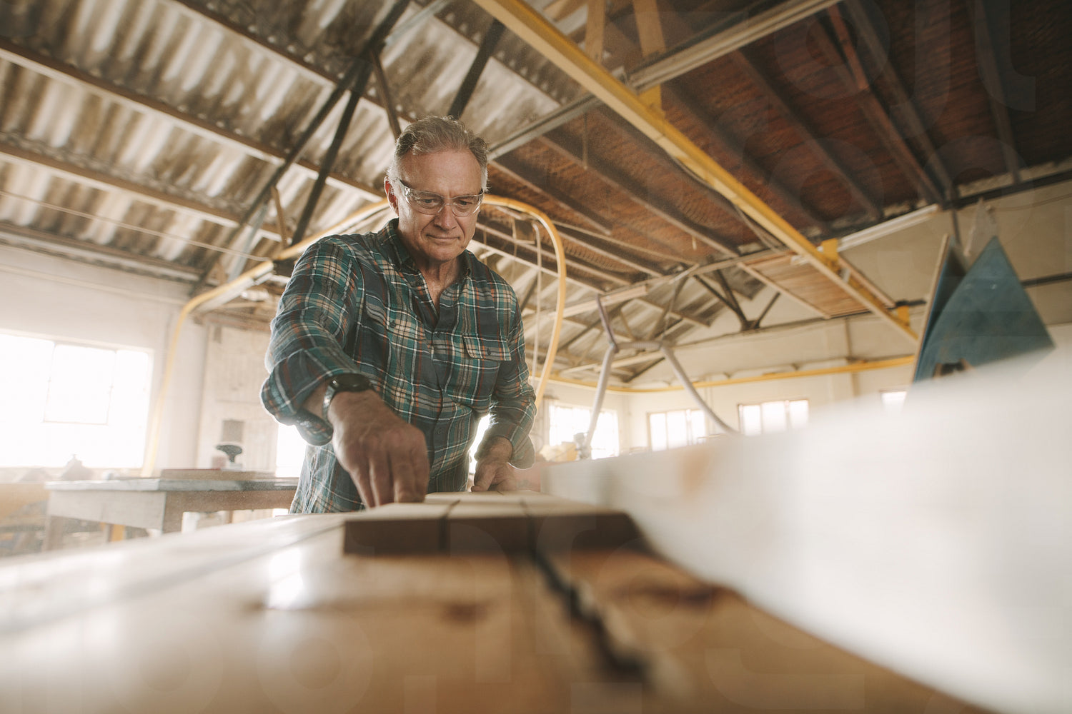 Senior male carpenter cutting wood on table saw machine. Mature caucasian man working in carpentry workshop.