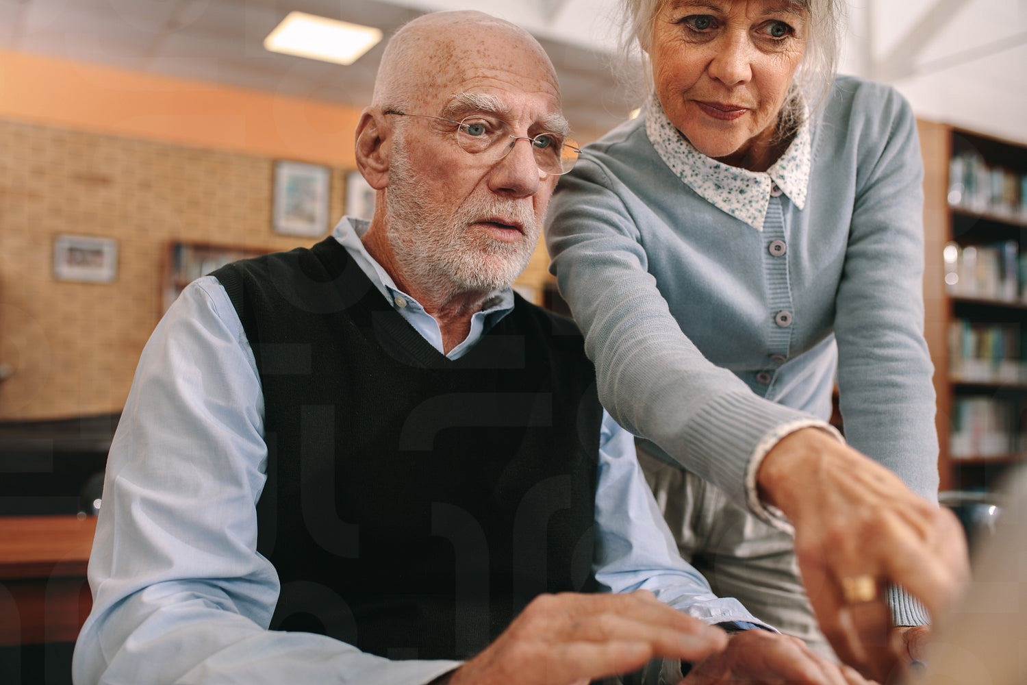 Senior woman pointing at a computer screen while an elderly man looks at it. Senior couple at a library using a computer.