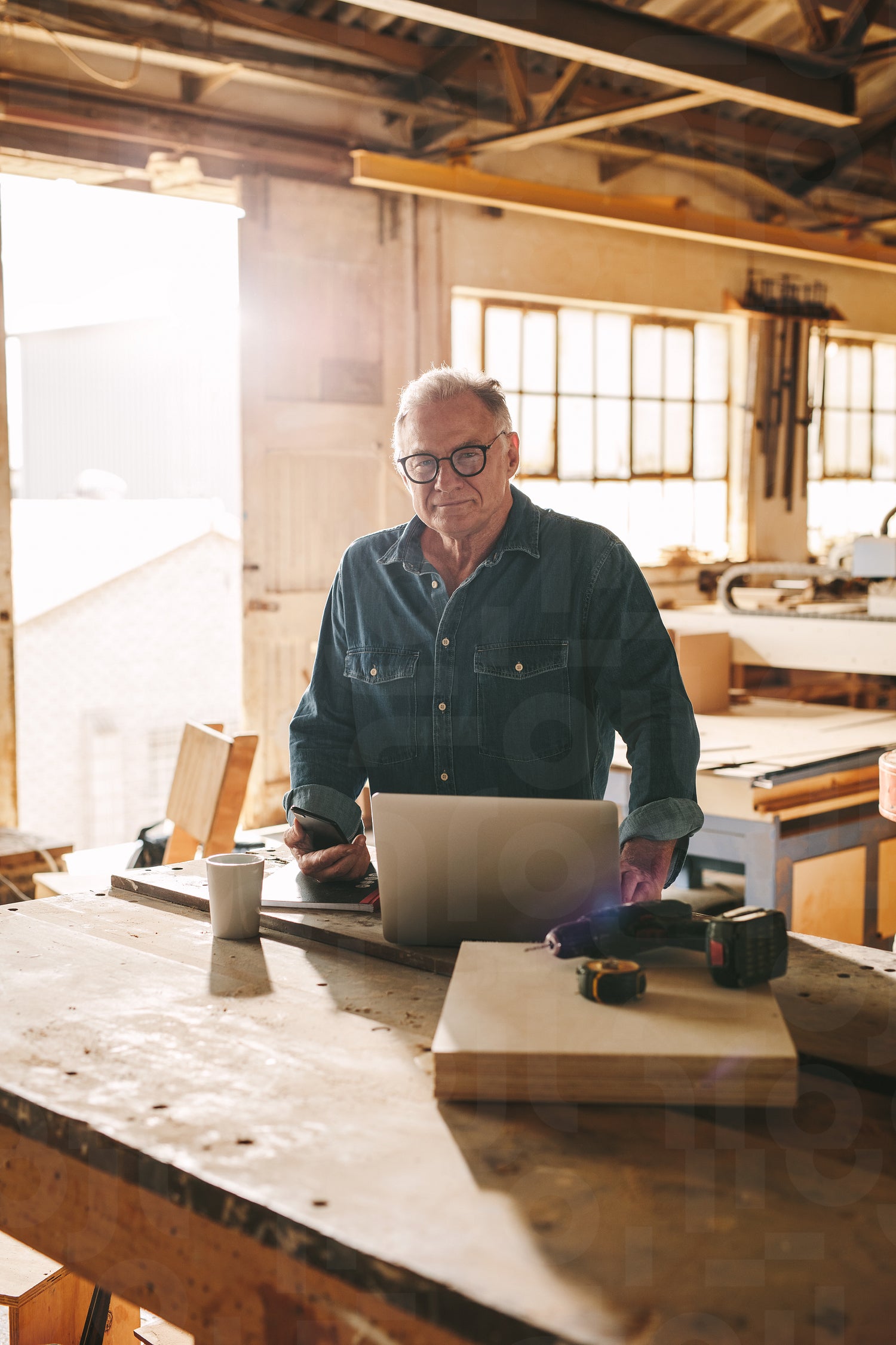 Senior men standing at his work table with laptop. Mature man at his carpentry workshop.