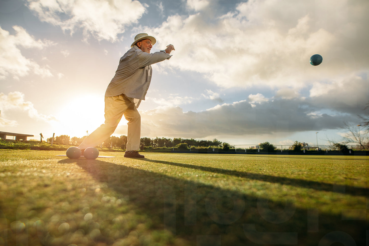 Man playing boules in a playground with sun flare in the background. Old man in hat throwing a boules in a lawn.