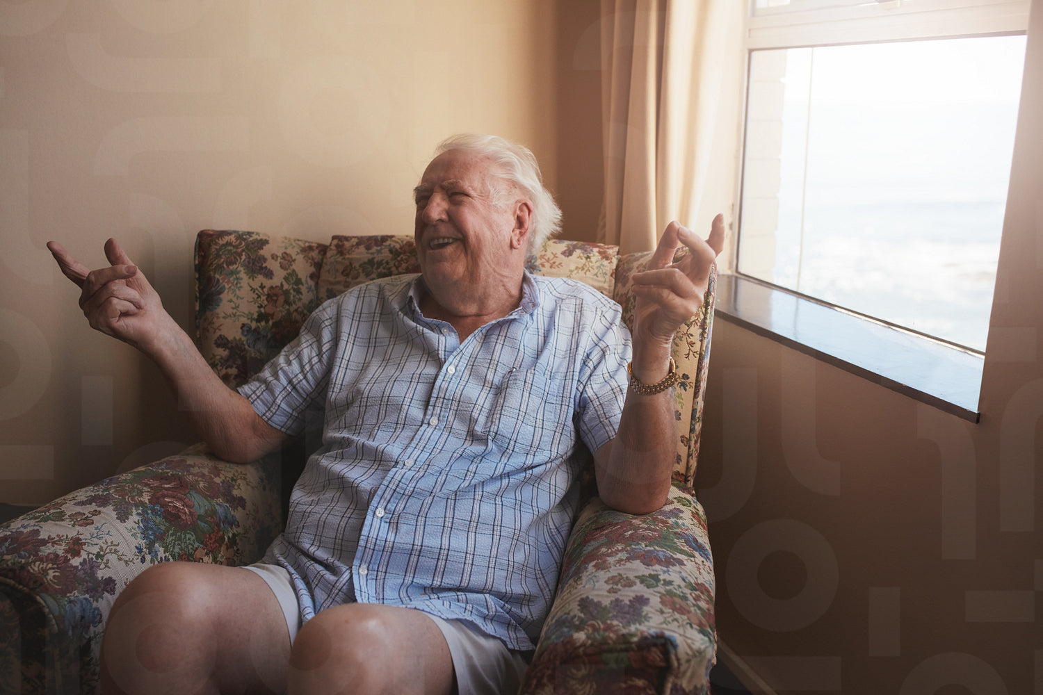 Indoor shot of happy old man sitting on a arm chair and smiling. Senior man relaxing at old age home.