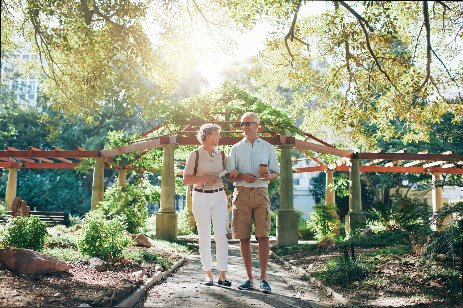 Full length portrait of senior tourist talking a walk through park. Mature tourist enjoying a walk in park.