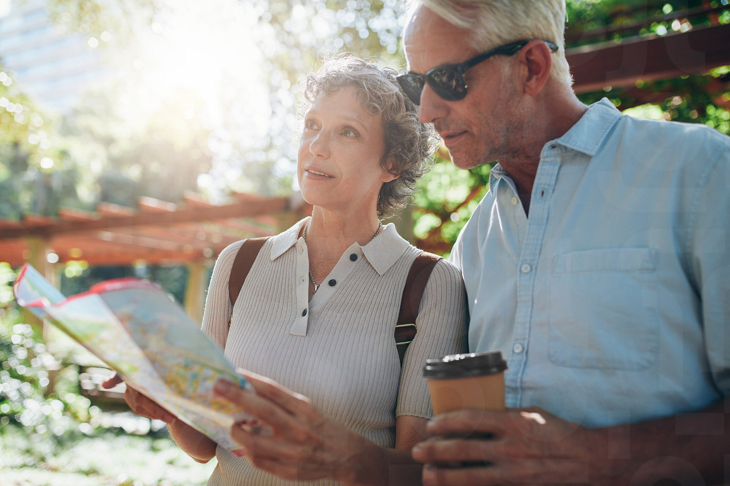 Close up portrait of senior couple using a map for directions. Retired couple exploring new places to visit during their vacation.