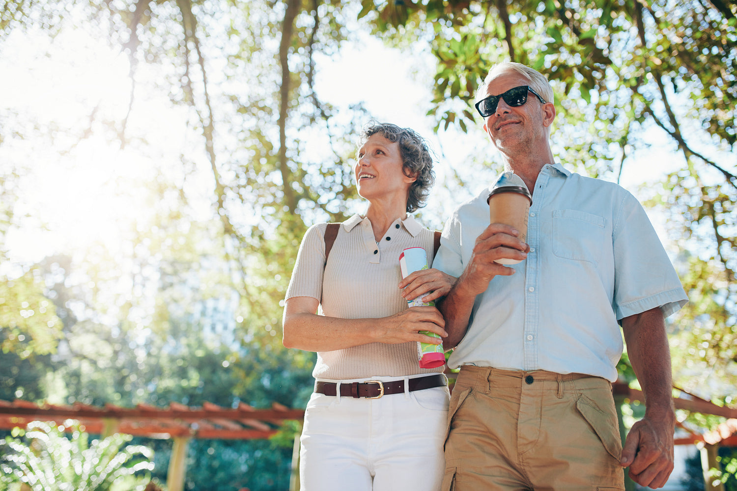 Portrait of senior tourists walking through a park. Mature couple on a summer vacation.