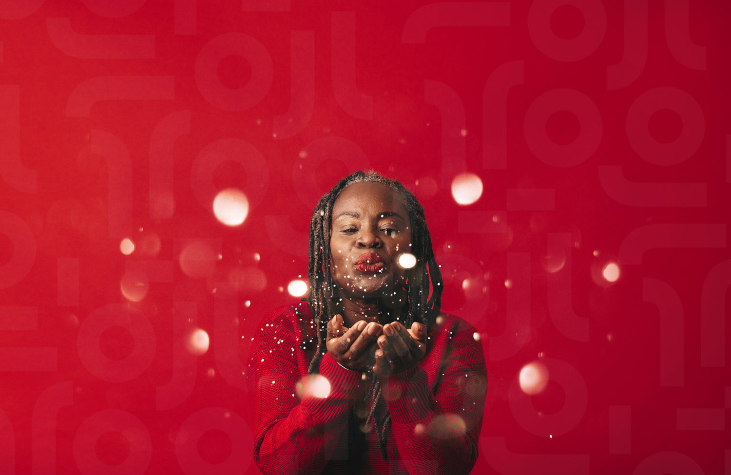 Happy black woman blowing confetti Into the air while standing against a red background. Mature woman with dreadlocks celebrating and having fun in a studio.