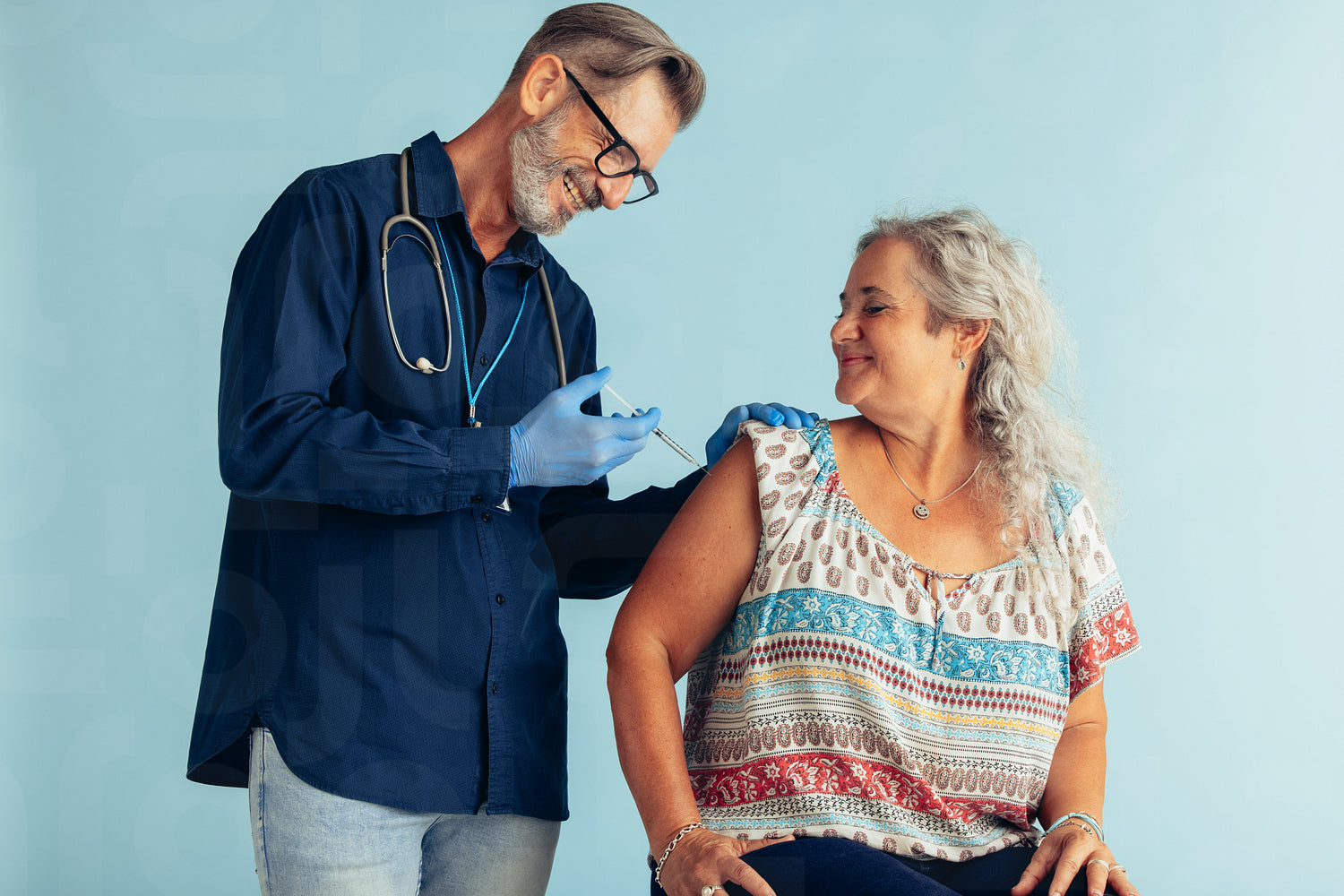 Senior woman getting flu vaccine injection by a medical professional. Doctor giving vaccination to elderly woman on blue background.