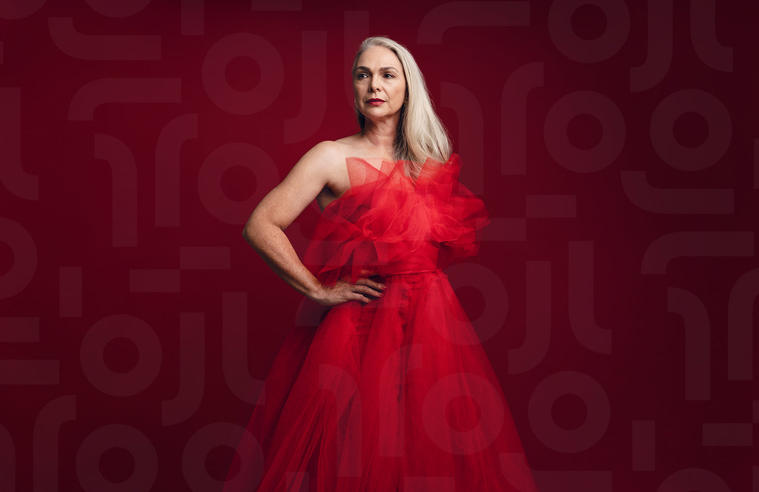 Attractive senior woman in a red evening gown looking away. Senior woman in an elegant red dress over red background.