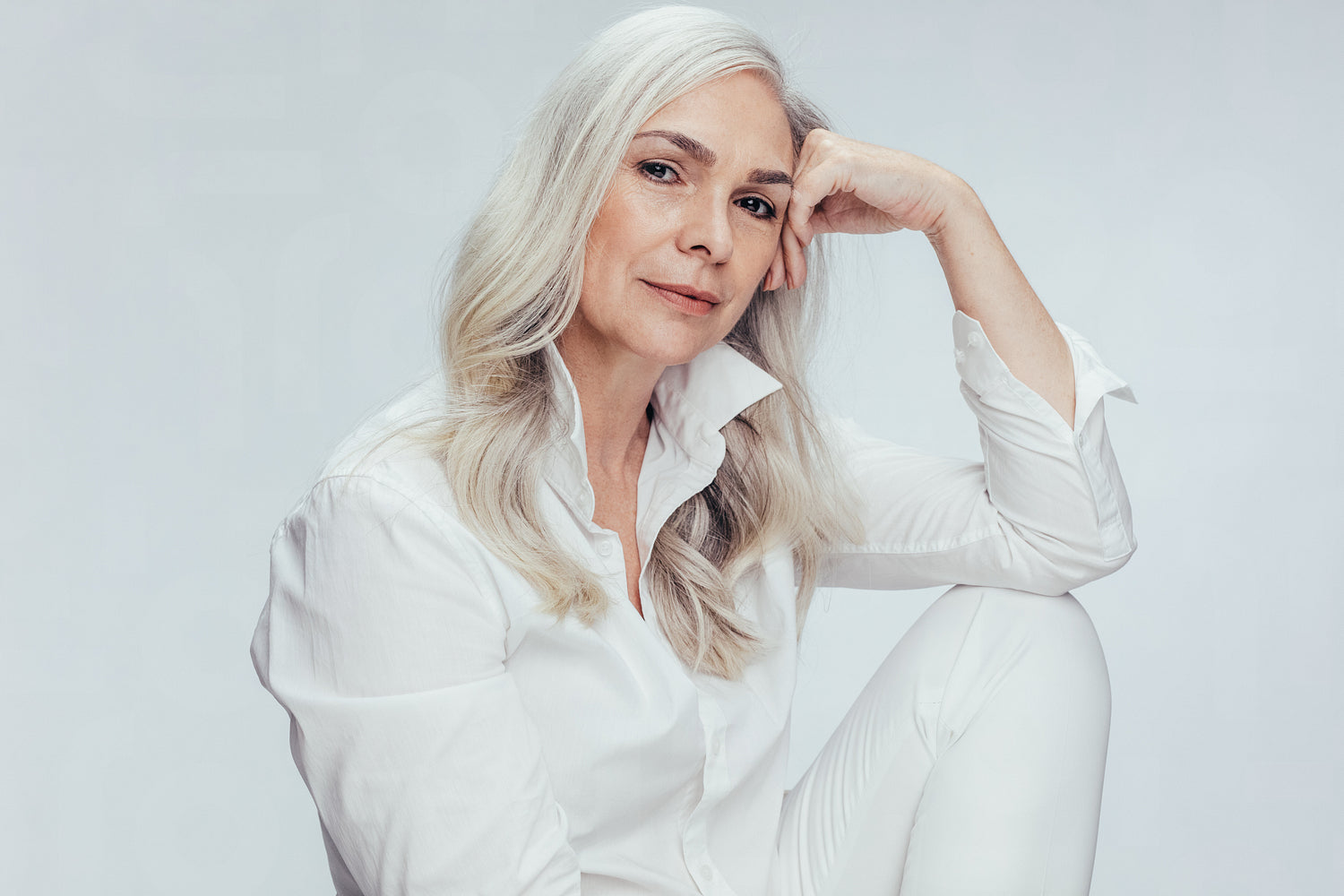 Senior woman sitting over white background. Mature caucasian woman sitting relaxed in studio with her hand on head.