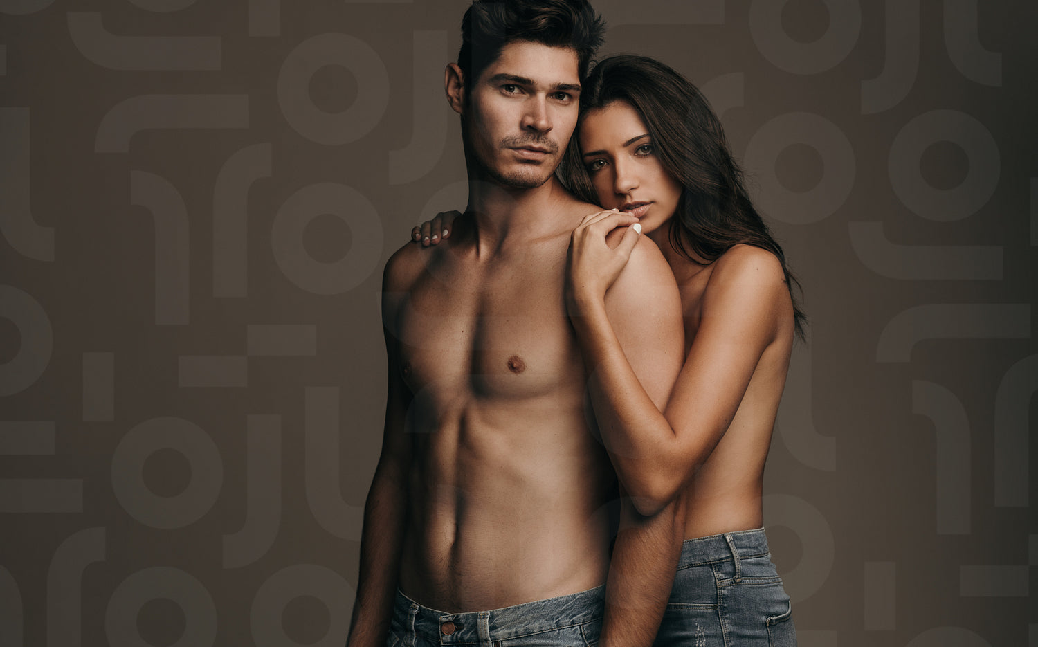 Beautiful young couple only wearing jeans standing together on brown background. Sensual man and woman looking at camera.