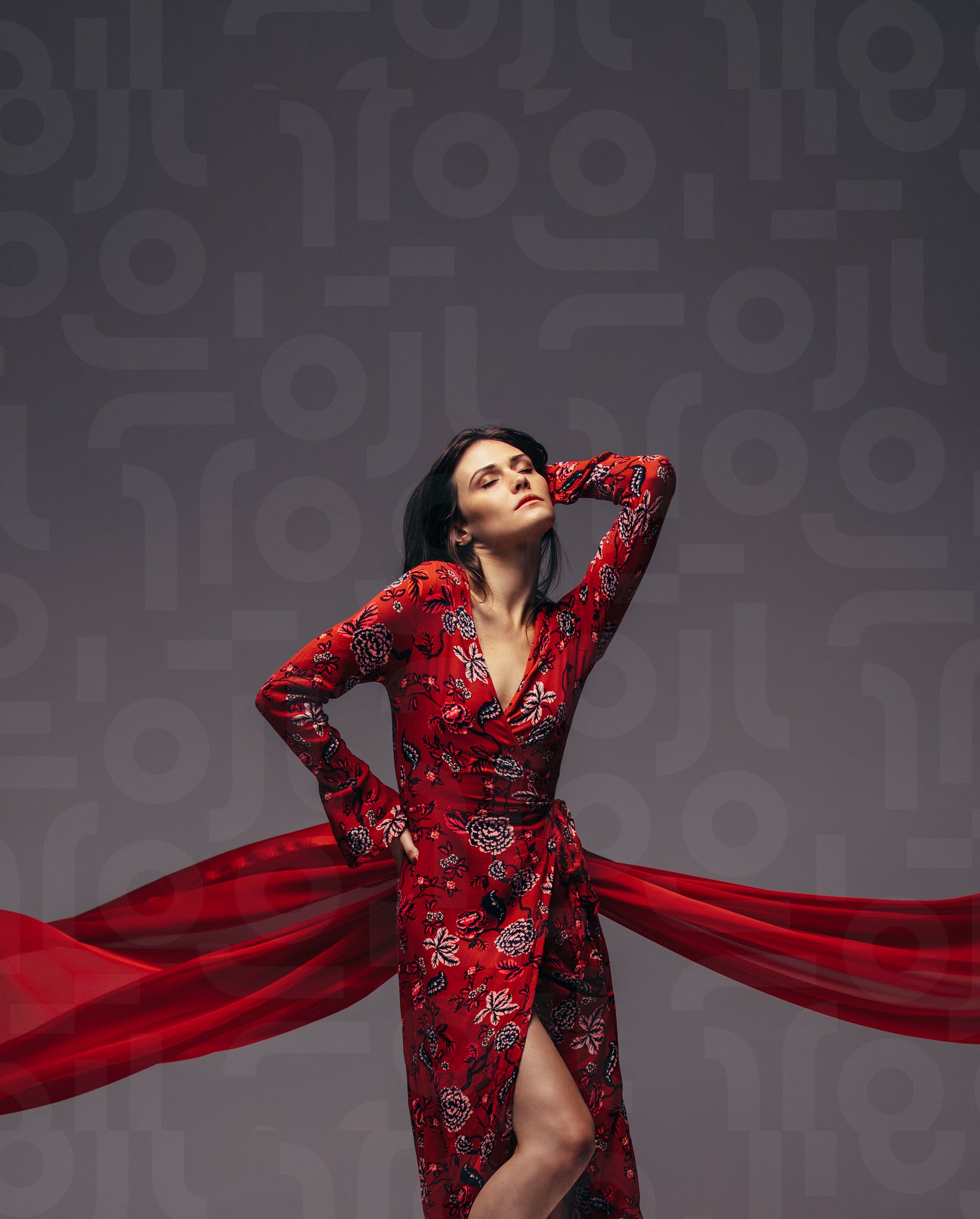 Sensual woman posing in red dress against grey background. Female model wearing beautiful dress.