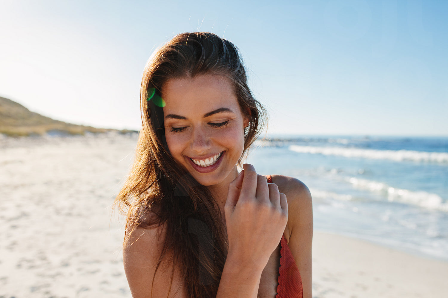 Close up portrait of sensual young woman on the beach. Smiling caucasian female model posing on the seashore.