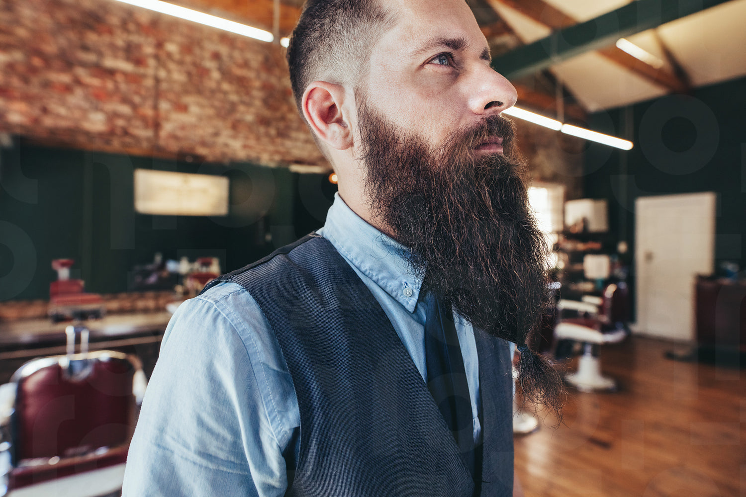 Close up of serious male barber with long beard. Hairdresser in salon looking away and thinking.