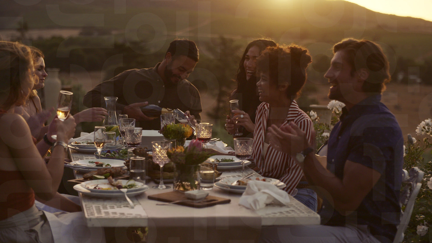 Man serving drinks to friends at party. Man pouring champagne into a glasses during dinner party for friend sitting at dinner table.