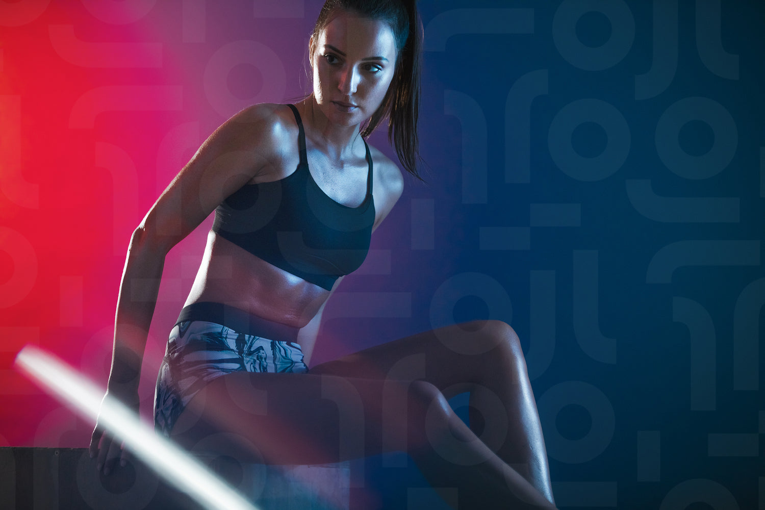Female athlete sitting on a box over colored background with gel effect. Sportswoman getting ready for exercising.
