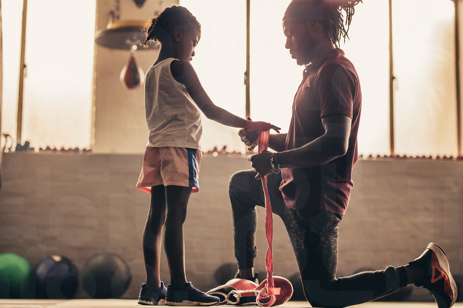 Side view of a boxing coach wrapping bandage on hands of a kid