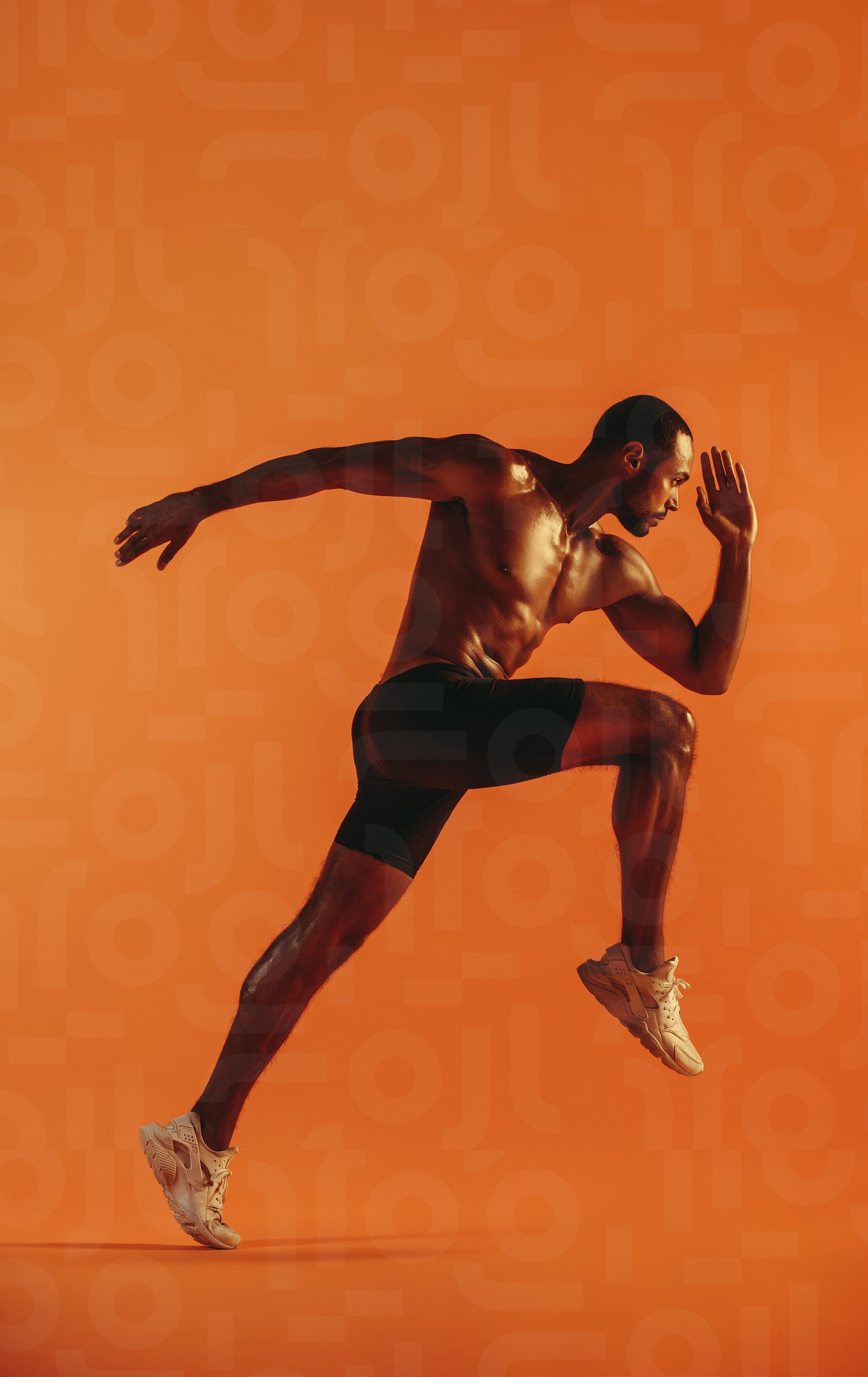 Bare chested athlete running with big stride forward on orange background. African american sportsman sprinting.