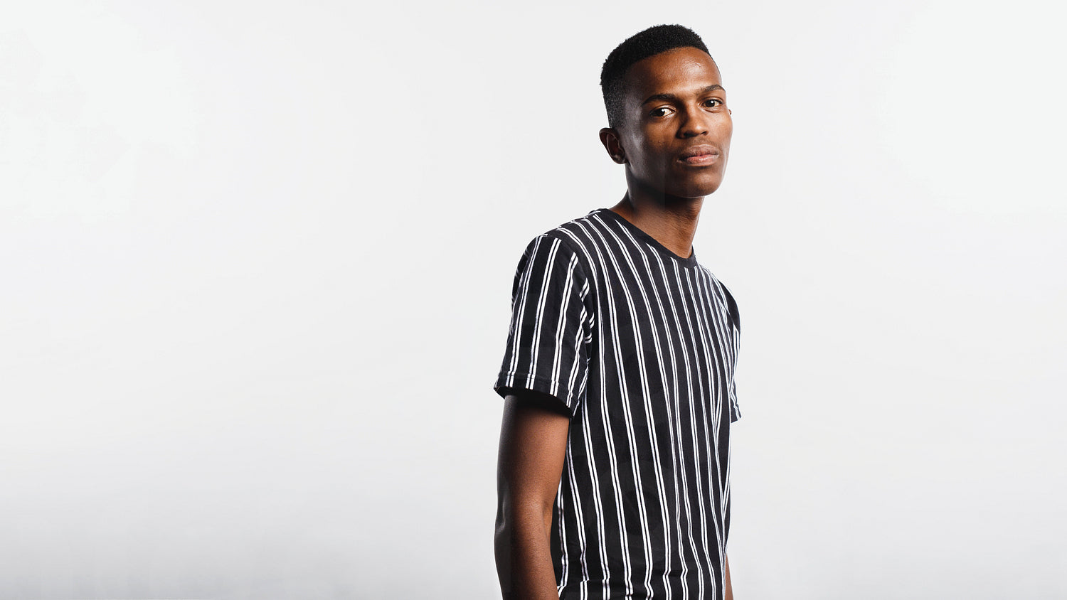 Portrait of an african man looking at camera. Side view of a man standing against a white background.