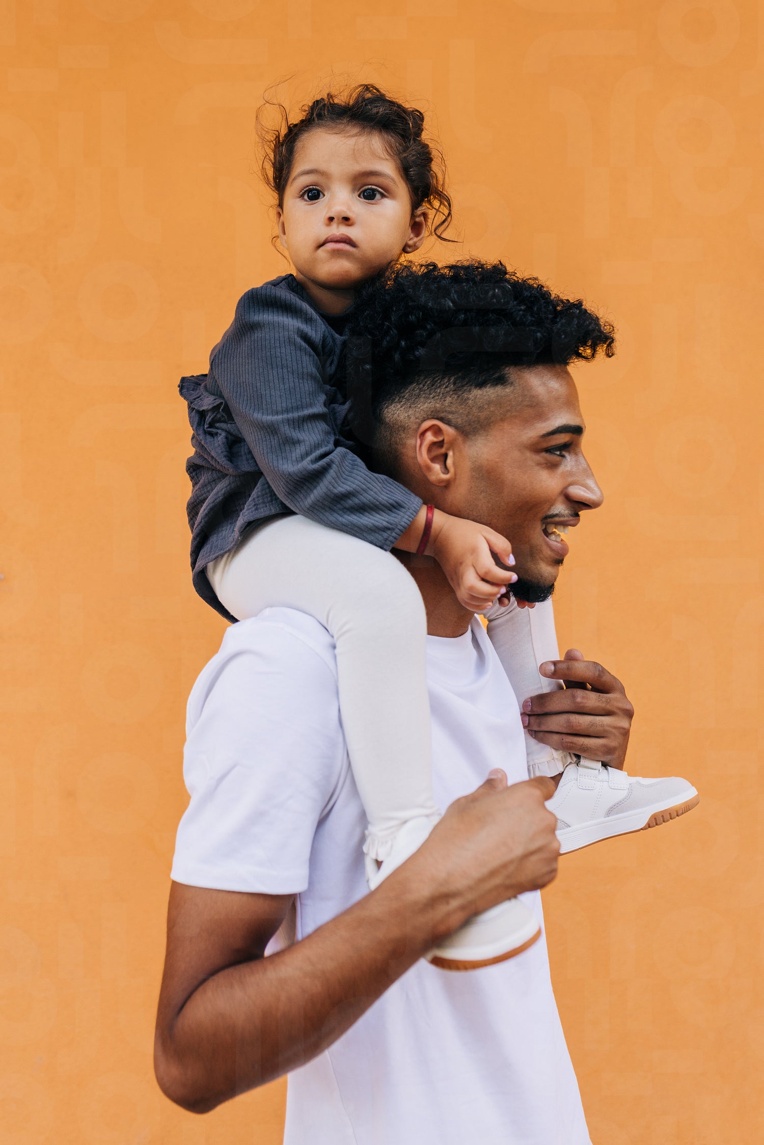 Single dad carrying his daughter on his shoulders against a studio background. Happy young father celebrating father's day with his adorable daughter.