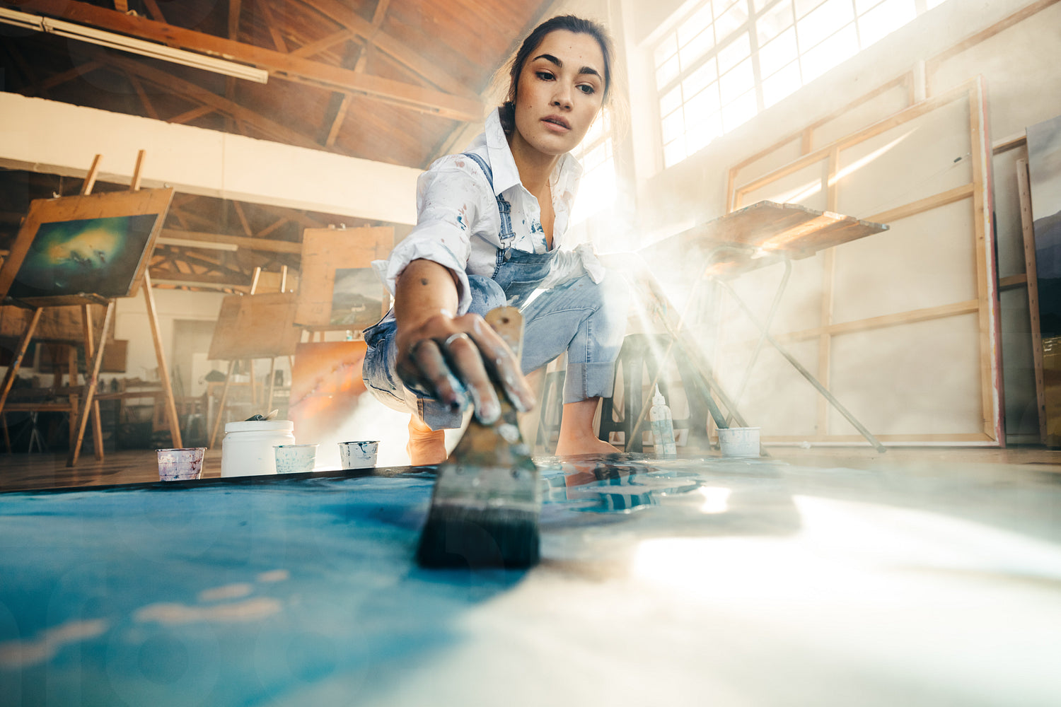Skilful young artist painting on a canvas with a paintbrush. Female painter making a blue painting for her new art project. Creative young woman working on the floor in her art studio.